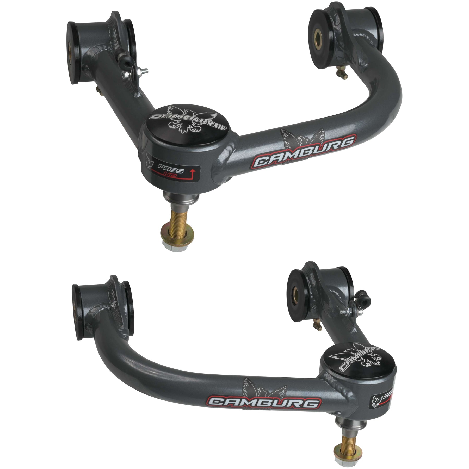 Using the latest CAD/CAM engineering software Camburg designed these arms to the strictest standards using their FARO laser scan arm to model the OEM parts and frames. Manufactured in-house, Camburg has the tubes CNC laser cut and bent, then are MIG welded in precision fixtures before sending out to be sandblasted and powder-coated. Camburg's in-house CNC machine shop makes all the machined parts including the uniball misalignment spacers from heat-treated stainless steel. Camburg prides itself in producing the best parts available under their own roof and control.