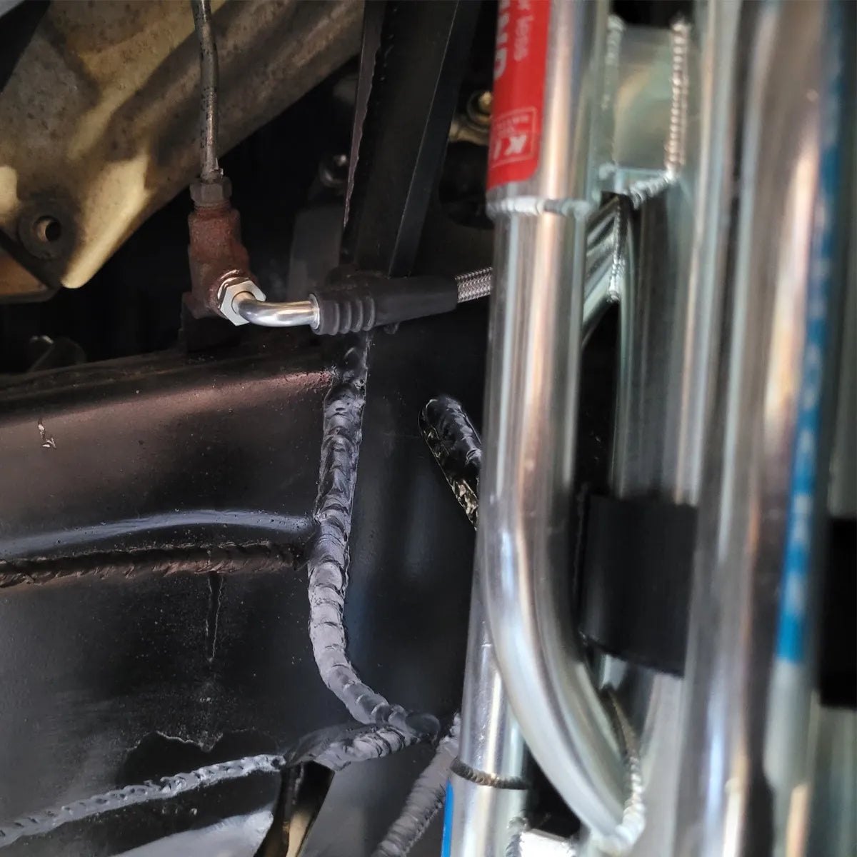 The high-clearance uniball lower control arm and the upper A-arm are fully boxed for strength under the most grueling off-road conditions and adds 3.5 inches of width on either side. The spindle wheel mount surface is fully machined from forged 1020 steel and the entire spindle is boxed with double-shear mounts for chromoly rod ends. The crossmembers are fabricated from 3/16” thick steel and incorporate 3-point mounting for the steering rack.