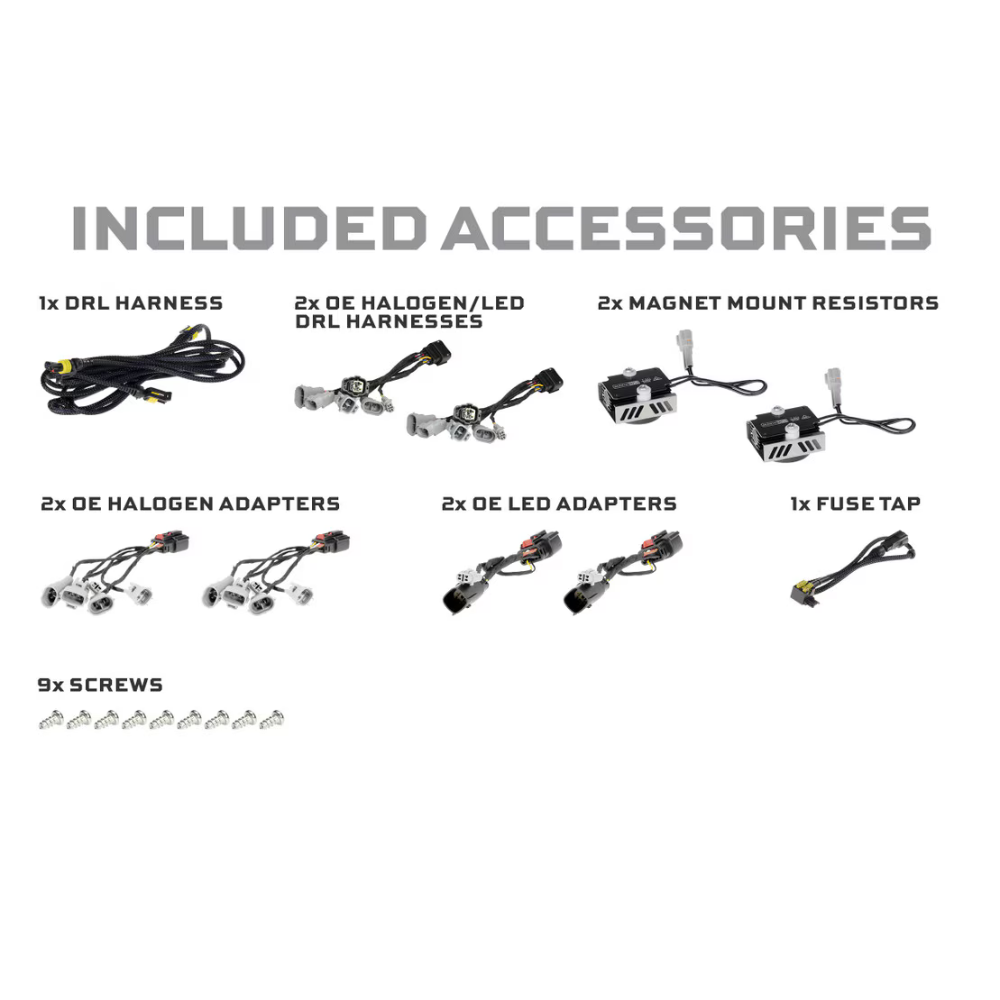 ✔ Accessories : 2x Halogen Adapters, 2x OEM LED Adapters, 1x DRL Harness, 2x Magnet Mount Resistors, 1x DRL Harness, 9x Screws, Fuse Tap Hardware